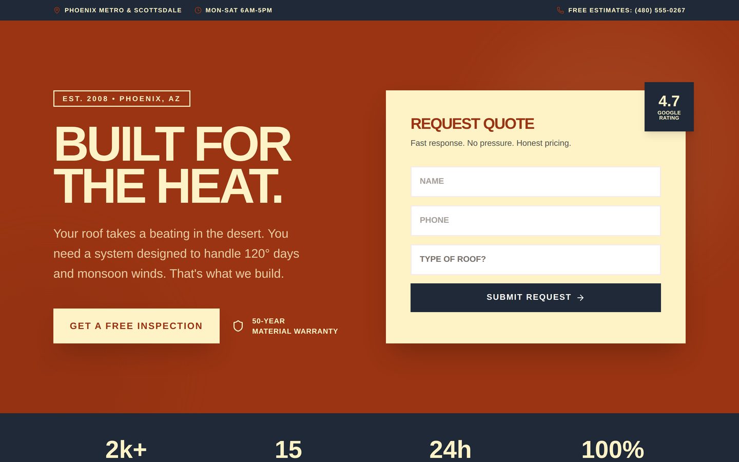 Terracotta and sand with massive display typography. Feels rugged and dependable — like the roofs they build.